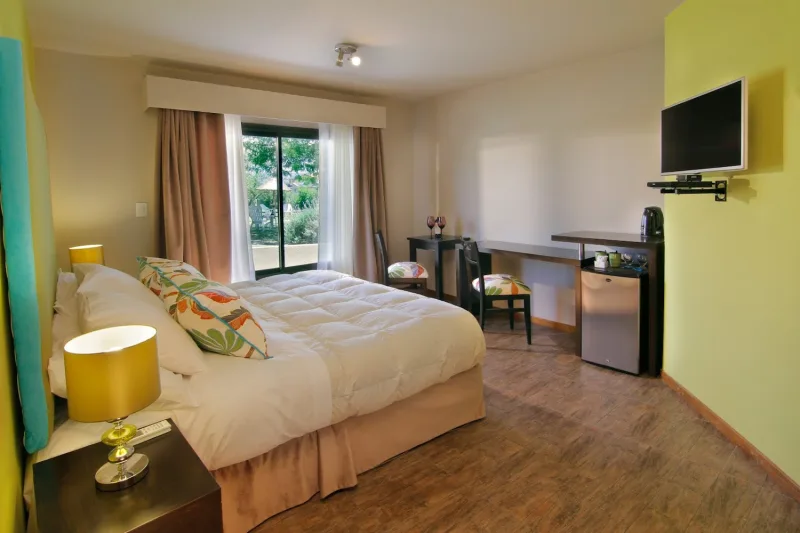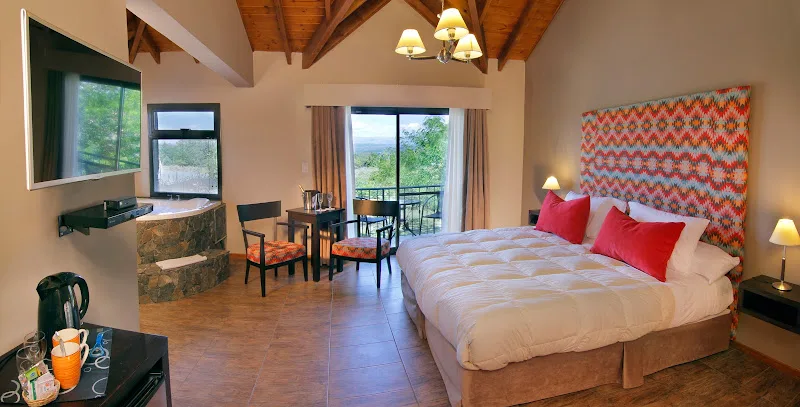 Hotel cálido con suites luminosas con vista a la naturaleza, comedor rústico, jardín y piscina al aire libre.