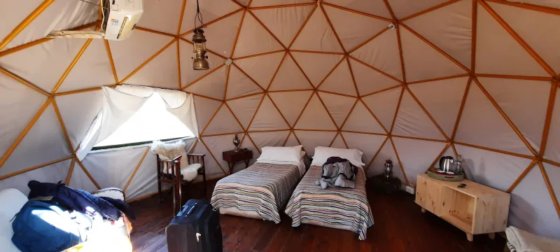 Cabañas y carpas permanentes en complejo turístico de montaña, con yoga, piscina al aire libre y delicatesen.
