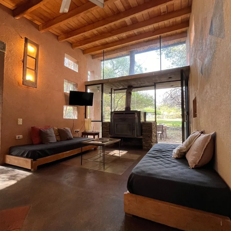 Tres casas de campo cálidas con detalles de piedra, cielorraso con vigas de madera y piscina al aire libre.