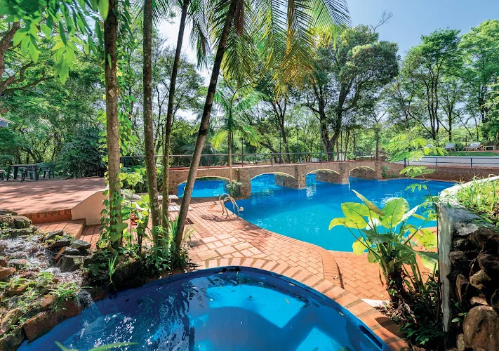 Hotel sencillo con habitaciones y cabañas informales, piscina al aire libre, canchas para deportes y desayuno.