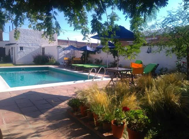 Casa de huéspedes informal con dormitorios sencillos, piscina al aire libre y utensilios para barbacoa.